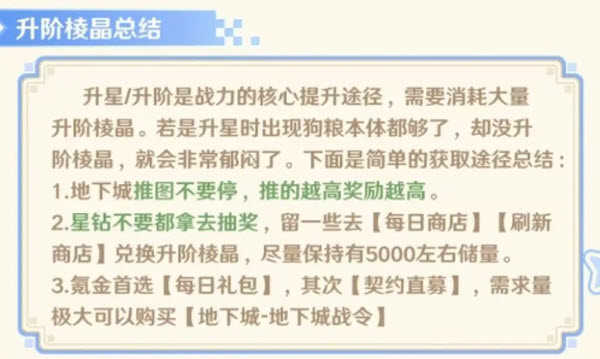 一、說明:升星與升階是提升戰(zhàn)力的關(guān)鍵手段,過程中需要大量升階棱晶作為材料支撐。