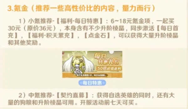 中度投入玩家推薦選擇契約直募禮包,該禮包除了能自選英雄外,還額外贈(zèng)送大量狗糧和升階棱晶,比較適合開服前七天購買。
