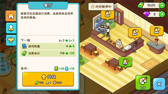 游戲開始運營后,玩家可點擊不同區域修復設施,解鎖區域后顧客便會前來消費。