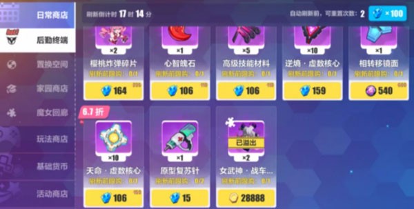 日常商店-后勤終端:可通過金幣購買角色碎片,也能以星石折扣價獲取相轉移鏡面或虛數核心,此外還有心智魄石等物品。