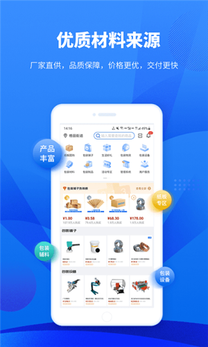 全品類精選,各類小物件盡在軟件中,設有紙板專區、包裝輔料以及包裝設備板塊。