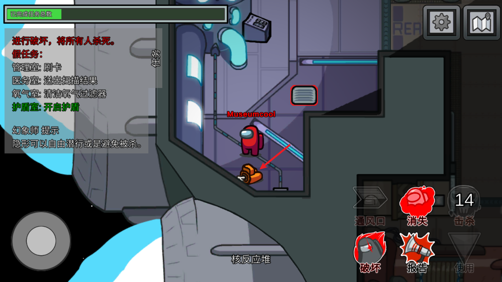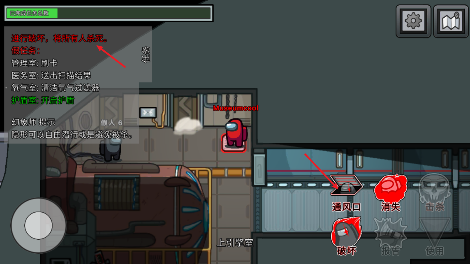 如果是壞人身份,你的名字會顯示為紅色,左上角的任務是虛假的,并且還能鉆進通風管道。