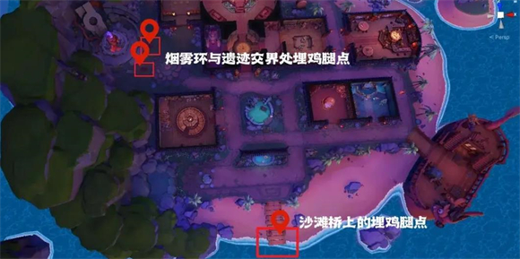 神龍島的管道呈水井狀散布于地圖各個(gè)區(qū)域,它們被劃分為4組,每組內(nèi)部的管道之間均可相互連通。處于劇毒狀態(tài)的生死溫泉能夠用來埋雞腿,另外,把雞腿拖到沙灘的橋上以及煙霧環(huán)和遺跡的交界處這兩個(gè)土坑位置,同樣可以完成埋雞腿的操作。