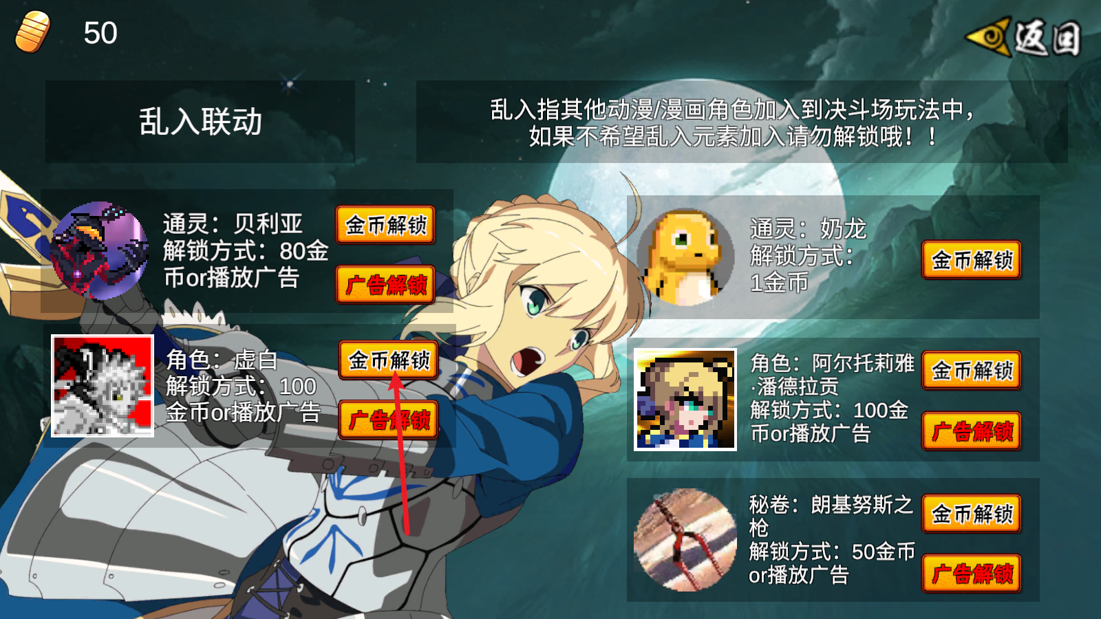 進(jìn)入后就能看到虛白和之前的Saber,它們都需要消耗一定數(shù)量的金幣解鎖,當(dāng)然也可以直接通過(guò)觀看廣告來(lái)解鎖。