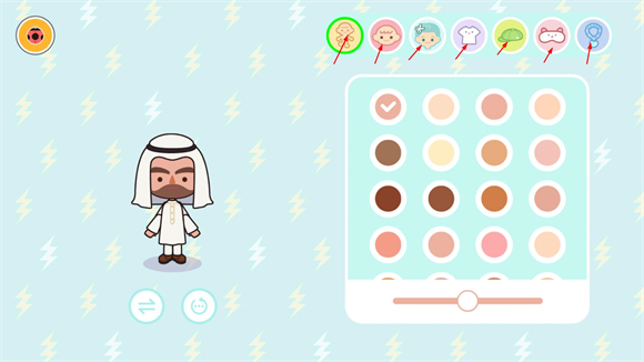 進入修改界面后,可通過點擊右上角的按鈕來調整對應內容,這些按鈕分別對應修改膚色、頭部五官、發(fā)型、服裝、頭飾、眼部裝飾和飾品。