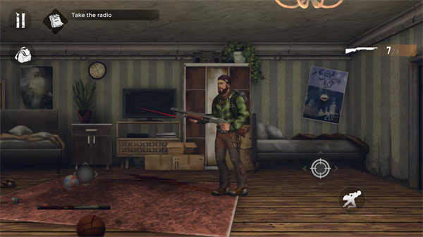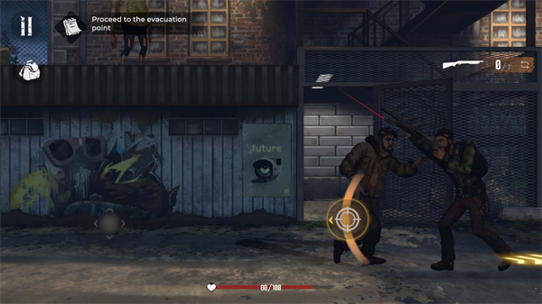 當(dāng)遭遇僵尸怪物時,可點(diǎn)擊射擊按鈕發(fā)起攻擊,而使用黃色按鈕則能投出手榴彈對敵人展開攻擊。