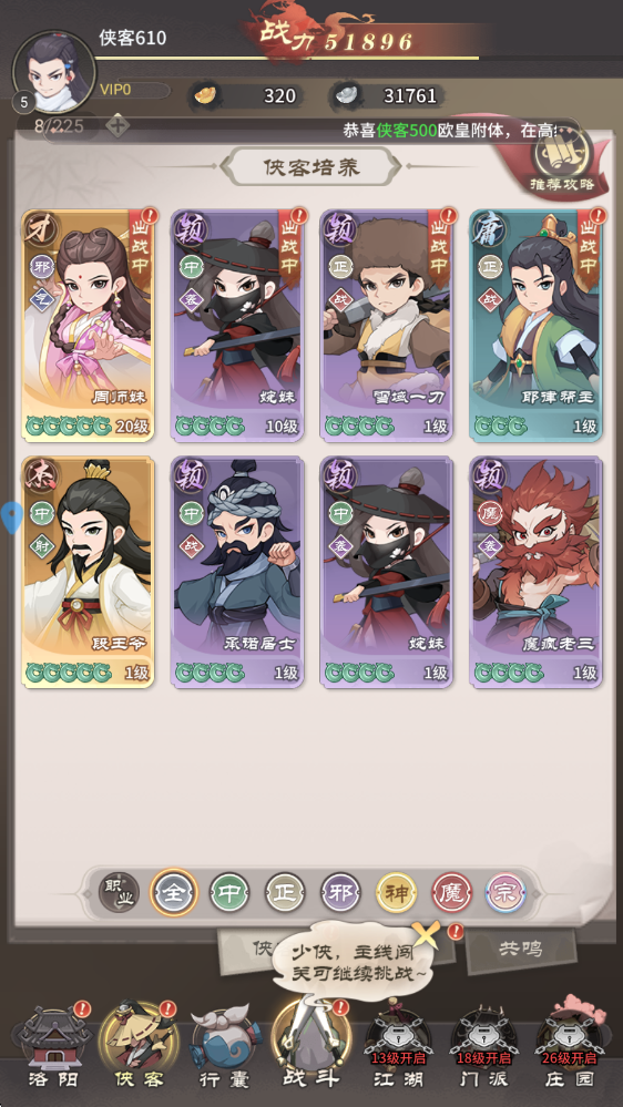 戰(zhàn)斗結(jié)束后,我們可以前往主城,在客棧處能夠招募新的俠客。