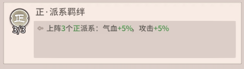 陣容羈絆:當(dāng)場(chǎng)上有3名正派系角色時(shí),全體角色的氣血與攻擊屬性均提升5%。