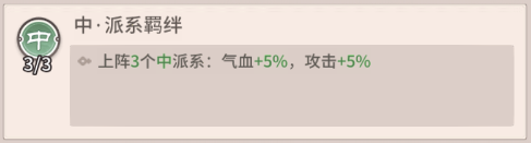 陣容羈絆效果:當(dāng)戰(zhàn)場(chǎng)上同時(shí)部署3名中派系角色時(shí),全體角色的氣血與攻擊屬性將各自提升5%。