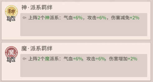 陣容羈絆:上陣2個(gè)神派系,氣血+6%,攻擊+6%,傷害減免+2%;上陣2個(gè)魔派系,氣血+6%,攻擊+6%,傷害增加+2%。