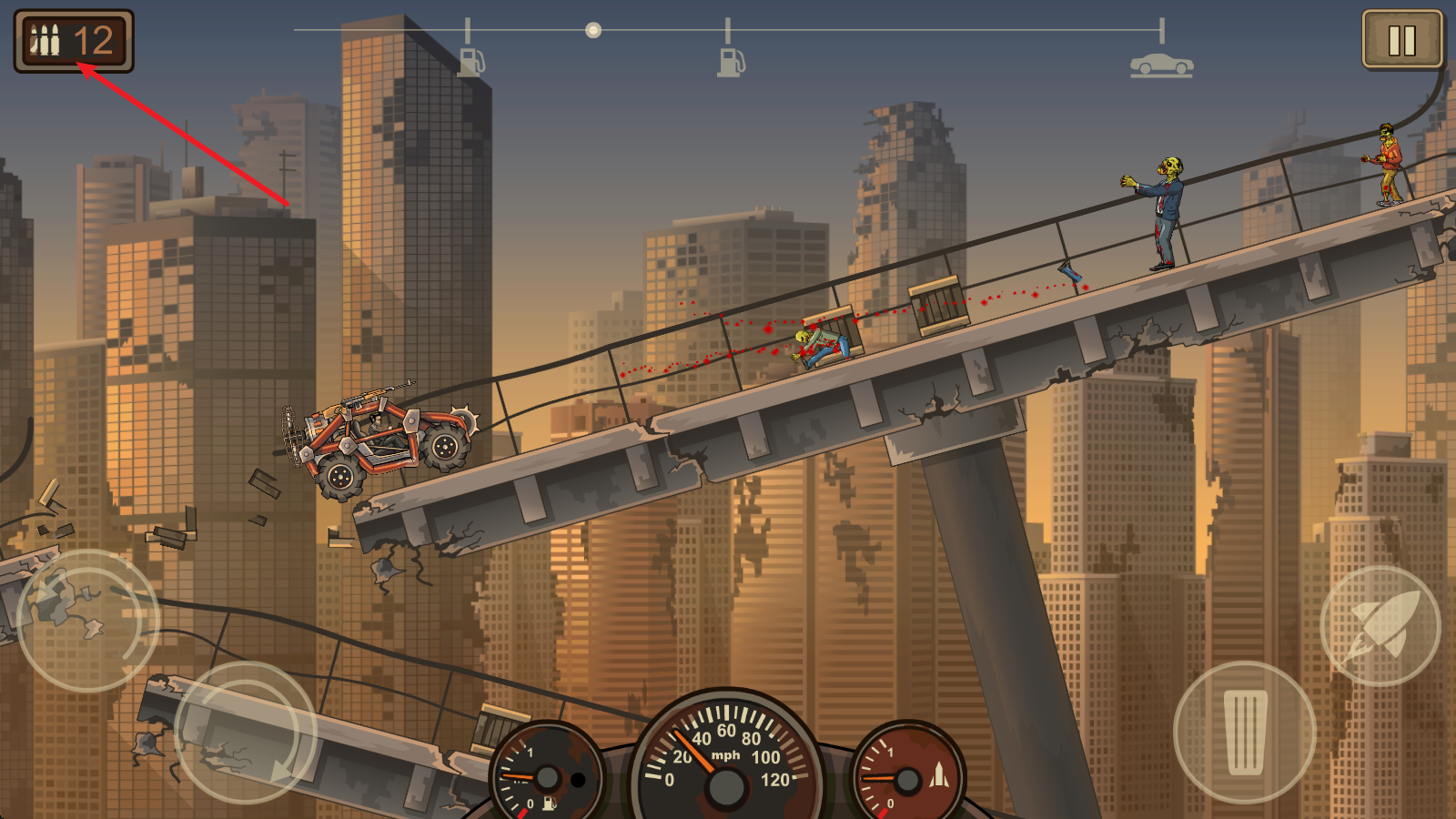 在前進(jìn)的途中會(huì)遇到大量僵尸,只要左上角還有剩余子彈,就會(huì)自動(dòng)發(fā)起攻擊。