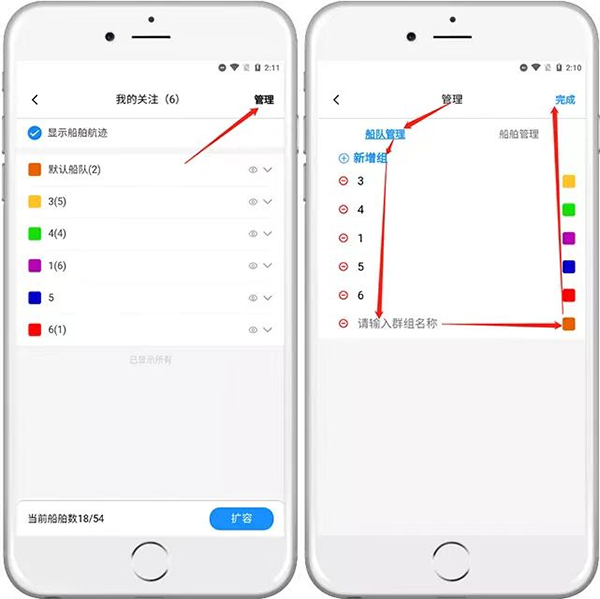 點(diǎn)擊左下角的【關(guān)注】圖標(biāo)后,你可以點(diǎn)擊管理,進(jìn)入管理頁面,選擇船隊(duì)管理,點(diǎn)擊新增組,然后輸入組的名稱并選擇組的顏色,點(diǎn)擊完成即可創(chuàng)建好組。