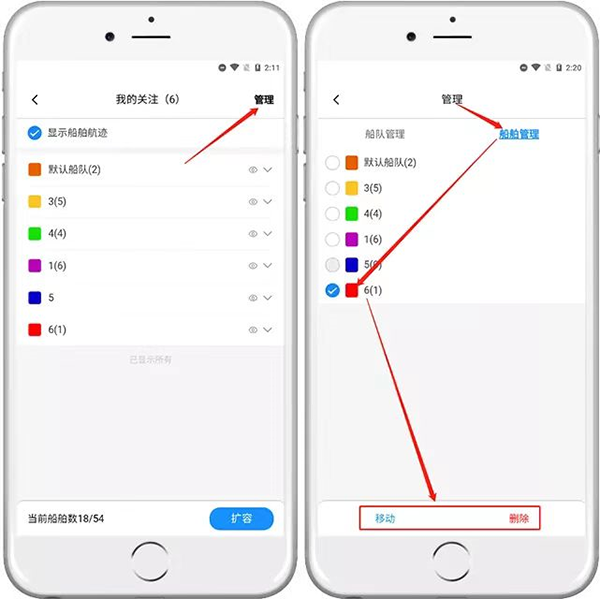 三、在船隊(duì)中對船舶進(jìn)行移動或刪除操作的步驟如下:點(diǎn)擊右上角的“管理”按鈕進(jìn)入管理頁面,接著選擇“船舶管理”選項(xiàng),選中需要移動或刪除的組后,點(diǎn)擊對應(yīng)的“移動”或“刪除”按鈕即可完成操作。