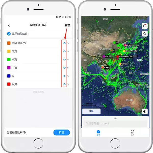 點(diǎn)擊右上角的“管理”按鈕,再點(diǎn)擊組右側(cè)的“小眼睛”圖標(biāo),就能在地圖上顯示所選組內(nèi)的船舶了。