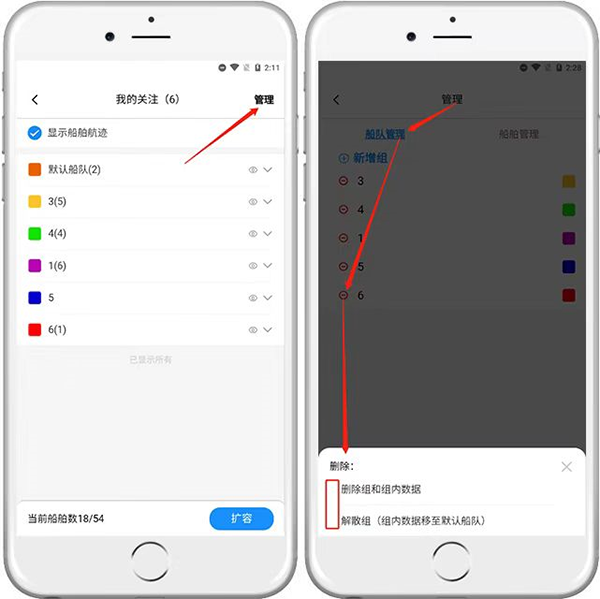 點(diǎn)擊右上角的管理,點(diǎn)擊船隊(duì)管理,選中想要?jiǎng)h除的組,在刪除組時(shí)可以選擇刪除組和組內(nèi)數(shù)據(jù)或者解散組(組內(nèi)數(shù)據(jù)移至默認(rèn)船隊(duì))。