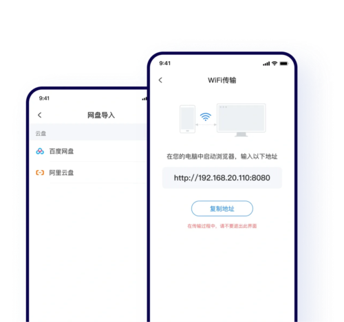 WiFi傳輸:手機與電腦連接同一WiFi網絡后,輸入指定網址,即可一鍵完成導入操作。