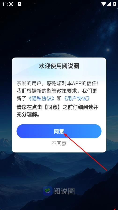 在“閱說圈”的歡迎彈窗里點擊“同意”按鈕,即可進入賬號密碼登錄界面。