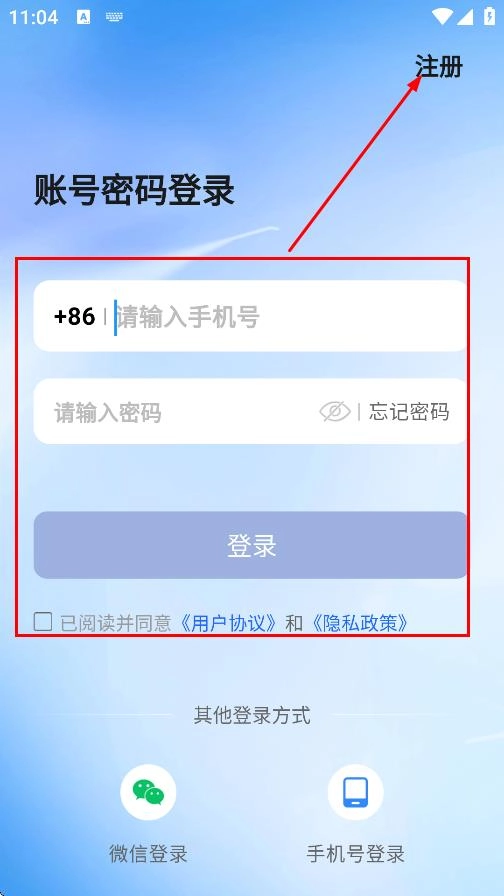 在賬號密碼登錄頁面,點擊注冊按鈕,進入輸入手機號頁面。