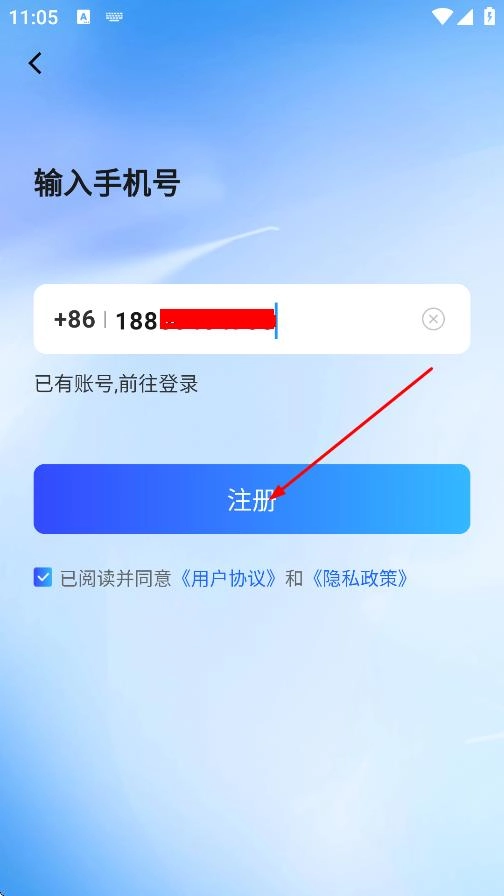 在填寫手機號碼的頁面,輸入對應的手機號,勾選同意相關協議后,點擊注冊按鈕完成操作。