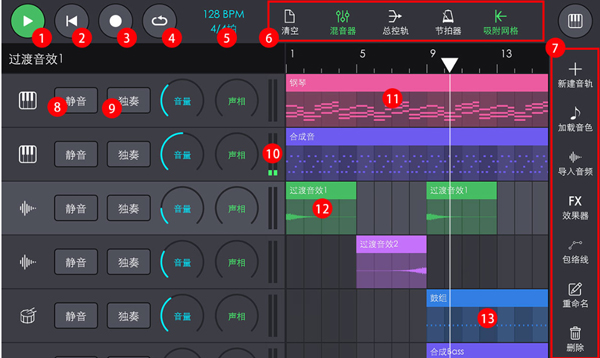 上方的控制欄支持滑動操作,其中最右側的“獨奏”功能能夠切換音軌的獨奏狀態,以此來決定播放時是否同步播放其他音軌。