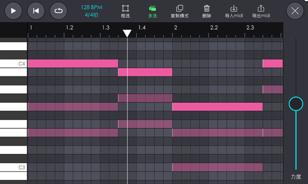 右側滑桿調節選中音符的力度。