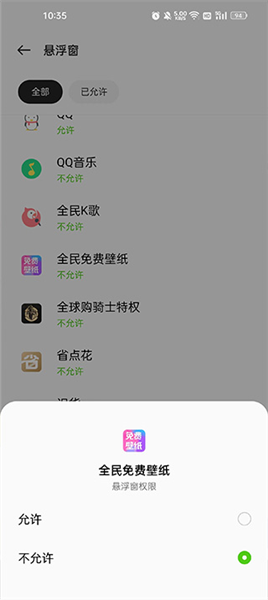 點擊右下角的設置為桌面壁紙,首先我們需要給它懸浮窗權限,找到軟件名稱選擇允許;