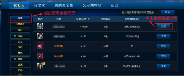 一、登錄諾亞傳說“聚寶樓”后,即可瀏覽本服務器上架待售的東西了。系統登陸后會默認顯示 【我要買】 > 【全部上架物品】界面,可以點擊左側的分類瀏覽當前本服務器正在出售的商品。