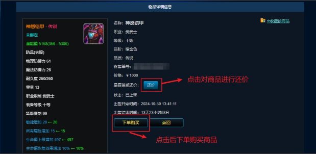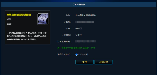 三、在裝備詳細信息頁面點擊 【下單購買】,則生成該物品的訂單,進入支付頁面。