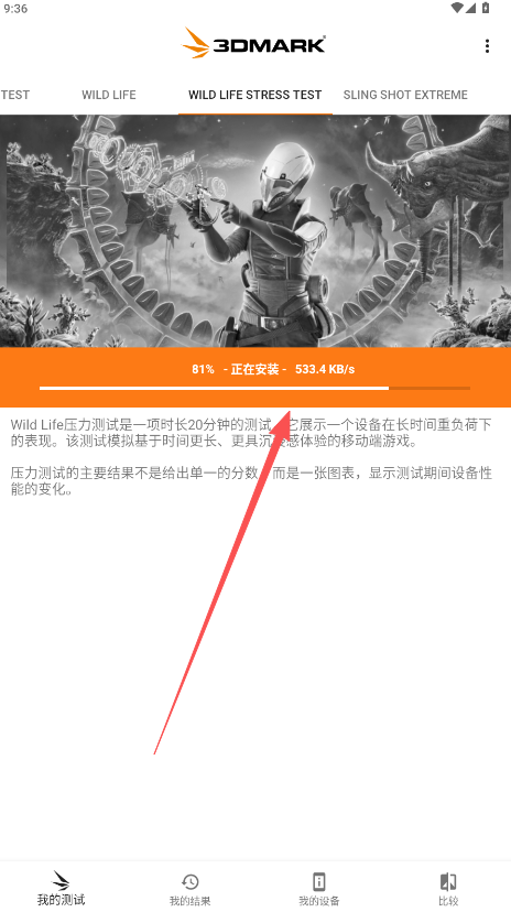 3DMark測試顯卡手機端需要先行測試數據,點擊等待數據安裝加載到100%。