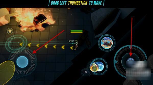 游戲啟動后,左側的虛擬搖桿負責操控角色的移動方向,右側搖桿則用來完成瞄準和射擊的動作。
