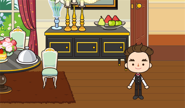 走到門口,你會看到服務員,餐廳里的食物也能品嘗,只要點擊并把食物拖到角色身上就能吃東西了。