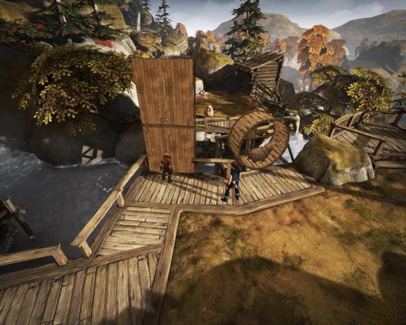 穿過農(nóng)舍后,折返回之前經(jīng)過的糧倉頂端,會(huì)看到一個(gè)正在哭泣的巨人。跟隨著巨人的腳步前行,它會(huì)協(xié)助兄弟倆越過重重阻礙。踩著巨人的肩頭渡過河流,接著攀爬對(duì)岸的枯藤,等候巨人攀爬上來。再次借助巨人的肩膀通過前方的路徑,最后與巨人互動(dòng),一同跳下瀑布,開啟新的冒險(xiǎn)征程。