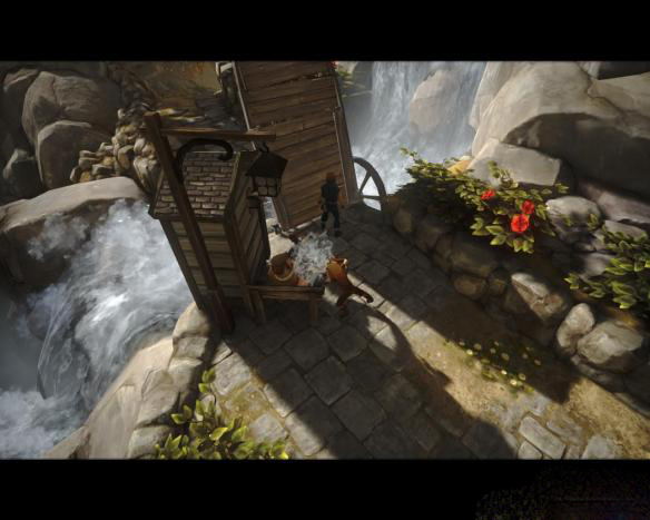 進(jìn)入村莊后,轉(zhuǎn)動(dòng)鏡頭找到三個(gè)形似鼓的物體,依次攀爬通過。隨后爬上左側(cè)的繩梯,從頂梁滑落到后院。這時(shí)守橋者再次出現(xiàn)攔住大門,操控弟弟穿過鐵柵欄轉(zhuǎn)動(dòng)把手放出狗,接著通過石門抵達(dá)另一座橋前。先讓弟弟和守橋者互動(dòng)吸引其注意力,再讓哥哥完成后續(xù)操作,順利放下吊橋。