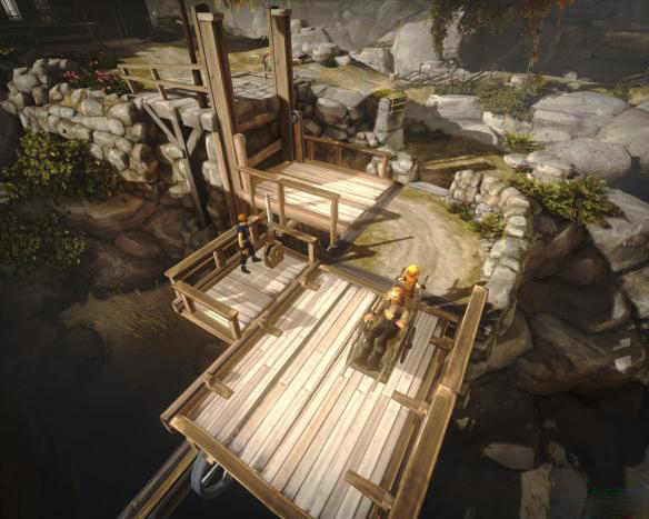 游戲開始后,順著小徑走到橋梁附近,會(huì)碰到一個(gè)簡(jiǎn)易謎題。此時(shí)弟弟力氣不夠,得靠哥哥幫忙扳動(dòng)把手。接著往右邊走,到達(dá)一處斷裂的梯子下方,哥哥要把弟弟舉起來,再讓弟弟放下繩索,好讓哥哥攀爬上來。最后兩人一起操作升降機(jī)把手,繼續(xù)向前推進(jìn)。(需兩人協(xié)作完成)