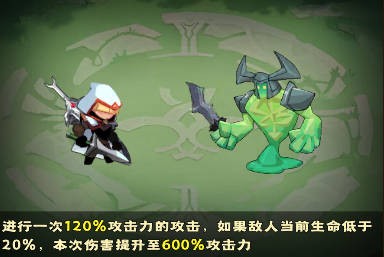 對敵人造成相當于自身攻擊力120%的傷害,當敵人當前生命值低于20%時,此次攻擊的傷害會提升到自身攻擊力的600%。