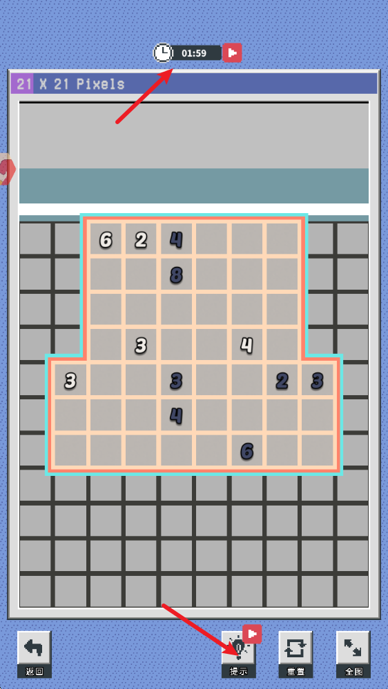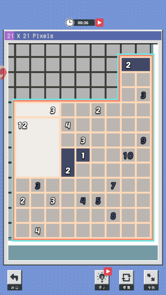 進入游戲后,系統會自動把圖片劃分成不同區域,你需要根據每個區域對應的數字,用尺寸各異的矩形把所有區域都填滿。