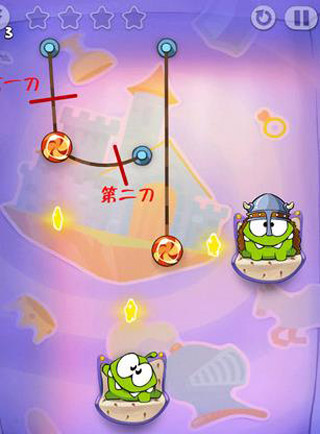 第三關的通關方法是:先切斷最左邊的繩子,讓它撞擊右側的糖果,這樣就能過關了。