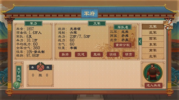 在戰(zhàn)爭期間,軍隊(duì)人員的保障始終是頭等大事。每次進(jìn)行擴(kuò)編時(shí),可前往兵府的整編界面來擴(kuò)大軍隊(duì)規(guī)模,同時(shí)開展訓(xùn)練以提升軍隊(duì)士氣,并為軍隊(duì)分配武器裝備等物資。不過要注意,每次擴(kuò)編都會(huì)消耗預(yù)備役兵員。獲取兵卒的途徑除了在戰(zhàn)斗中收編降兵外,接納叛軍也能補(bǔ)充一部分兵力,但這些方式所獲得的士兵數(shù)量,相較于實(shí)際需求而言往往是遠(yuǎn)遠(yuǎn)不夠的。倘若不想成為一味崇尚武力、濫用兵力的君主,那就還是踏踏實(shí)實(shí)地著重發(fā)展國內(nèi)政治、經(jīng)濟(jì)等內(nèi)政事務(wù)吧。