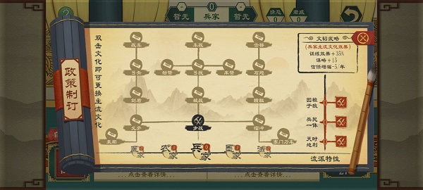 各個(gè)流派的政策對(duì)國家產(chǎn)生的影響存在差異,像儒家能夠提升君王的威望并加強(qiáng)教化,兵家有助于提高訓(xùn)練效率,墨家可以加快建造速度等。在國家發(fā)展的不同階段推行相應(yīng)的政策,能夠更有效地促進(jìn)國家的良好發(fā)展。