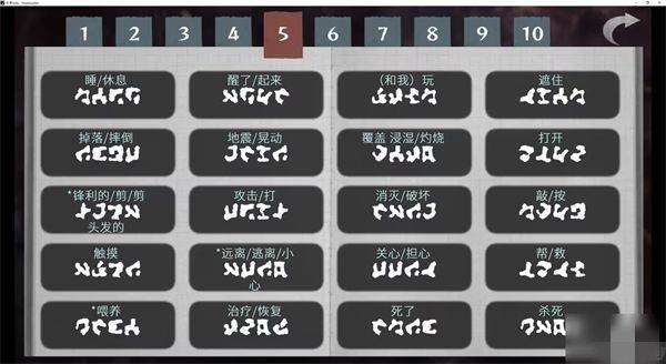 可惡!該死的、敵人/敵對的、是好的/友善的、朋友、關注/好奇/理會、無聊、能夠、厲害/簡單、餓、好吃、痛苦/弱、長的、小/變小、大/變大、少的/少許/很快的、多的/許多的/很久的、快速的、慢慢的、光明/亮的、黑暗