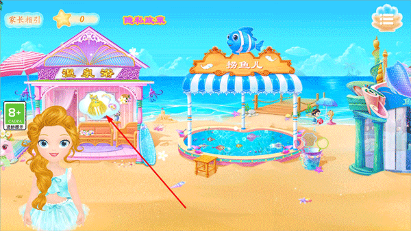 打開莉比小公主的完美沙灘之旅這款游戲,然后進入沙灘聚會場景。沙灘上分布著各式各樣的小商店,接下來點擊公主的想法,一同開啟探索之旅。