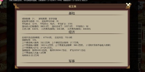 國庫的主要收入來源為各地的收支情況,其中商業(yè)板塊負(fù)責(zé)銀兩收益,礦業(yè)板塊負(fù)責(zé)礦石收益,農(nóng)業(yè)板塊負(fù)責(zé)糧草收益,并且城市等級越高,對應(yīng)的各項收入也會隨之增加。內(nèi)庫的收入主要來自自宅產(chǎn)出以及國庫分成(具體分成比例尚不明確),同時還需扣除自宅支出、后宮支出和隨從支出。貿(mào)易機(jī)制與《帝成》大致相似,高智力屬性會對貿(mào)易收益的下限產(chǎn)生影響,高野心屬性則會影響貿(mào)易收益的上限。二者的不同之處在于,這里的貿(mào)易存在成功概率問題,而且進(jìn)行貿(mào)易活動需要預(yù)先投入資金。
