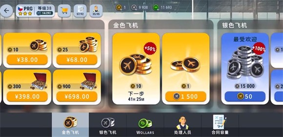 游戲里的金幣可用于解鎖機場和飛機。獲取金幣的途徑包括:一是直接充值;二是通過手冊獎勵以及部分活動航班的贈送;三是用銀幣兌換——1500銀幣能兌換1個金幣,該兌換操作24小時后可再次進行;另外,1萬銀幣可兌換10個金幣,此兌換則需間隔一周才能再次使用。 至于銀幣的獲取方式,主要有三種:其一,手冊和活動航班會提供銀幣獎勵;其二,每趟航班完成一個階段的合同任務后,就能獲得相應銀幣;其三,點擊左上角的小黃車,每24小時可領取100銀幣,若觀看廣告還能額外再領100銀幣。