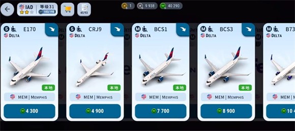 游戲內的飛機類型相當豐富,涵蓋了市面上的主流機型,具體劃分為小型、中型、大型與超大型四類。玩家若想購買飛機,需先使用金幣解鎖機型,之后再用綠幣完成購買流程。游戲中的手冊功能類似于通行證,每個機場都配備了專屬手冊;手冊設有兩個等級,其中高級手冊需要消耗金幣解鎖,且不同機場解鎖所需的金幣數量存在差異。手冊內容包含合同、飛機、涂裝等獎勵,解鎖后的涂裝可在其他機場的同款飛機上通用;此外,手冊還會提供一定數量的金幣、銀幣、綠幣,以及額外的合同位置。