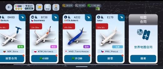 游戲里的合同共有本地、地區、國際、地圖、隨機玩家這五種類型。本地合同僅能簽約附近數量不多的機場,且通常只會刷新出S型和M型飛機,但它在合同界面無需綠幣即可簽署,每小時刷新一次,也能用100銀幣手動刷新。地區合同可簽約的目的地有所增加,其刷新的飛機一般為M型,從這類合同開始就需要消耗綠幣來簽署了,費用大概在5000綠幣上下,刷新時間通常是20小時左右,也能花費1000銀幣進行刷新。當解鎖國際合同后,玩家就能簽約世界各地的合同,這類合同刷新的都是L型飛機以及少量X型飛機,簽署價格約為15000綠幣,刷新周期在45小時左右,還可以用200金幣來刷新。隨機玩家合同刷新的都是其他玩家的飛機,機型種類比較多樣,是隨機出現的,而且簽署不需要綠幣,每小時刷新一次。世界合同則是供玩家簽約各地相關合同的,不同機場對應的世界合同,可簽約的地點會存在一些差異。