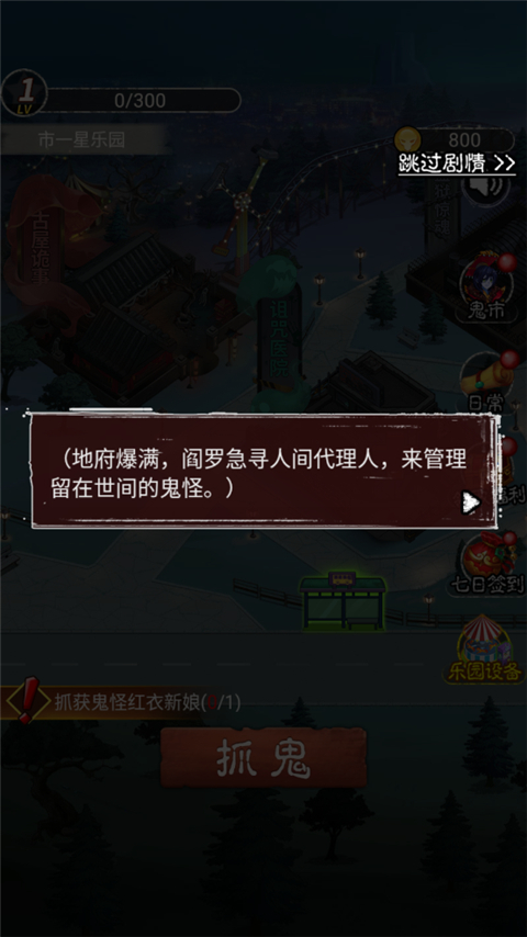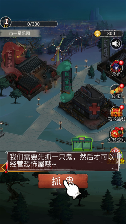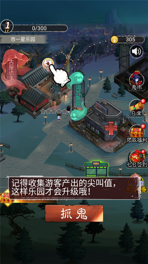 通過劇情可知,玩家要經(jīng)營一家鬼屋,里面的鬼魂全是在世間漂泊的孤魂。首先得抓一只鬼才能開啟鬼屋經(jīng)營,所以先點(diǎn)擊“抓鬼”按鈕吧。