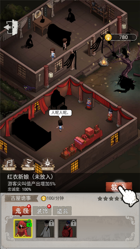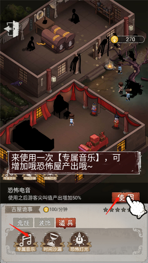 然后點(diǎn)擊道具,選擇專屬音樂,增加恐怖屋的產(chǎn)出;