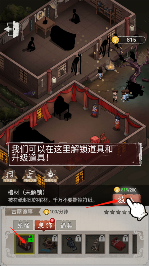 接下來需要布置鬼屋,具體操作是點(diǎn)擊裝飾選項(xiàng),找到并選擇解鎖棺材,解鎖完成后點(diǎn)擊放入即可。