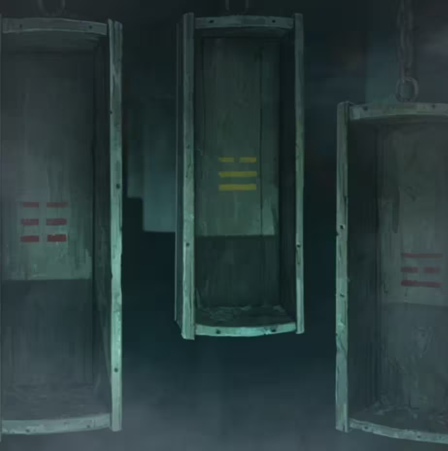 切換大地圖前往【稱骨齋】,找到左下角的八卦桌,使用【骨幣】即可獲取線索,記錄下【三長對應紅,長長短對應紅,長短短對應黃】;之后返回【喜送閣】,查看左上角懸掛的棺材,把【長命鎖】放置在右上角刻有“長命百歲”的棺材上,待三個棺材全部打開后,就能得到另一半線索,記錄內容為【短短短對應紅,短長長對應黃,長短長對應紅】。