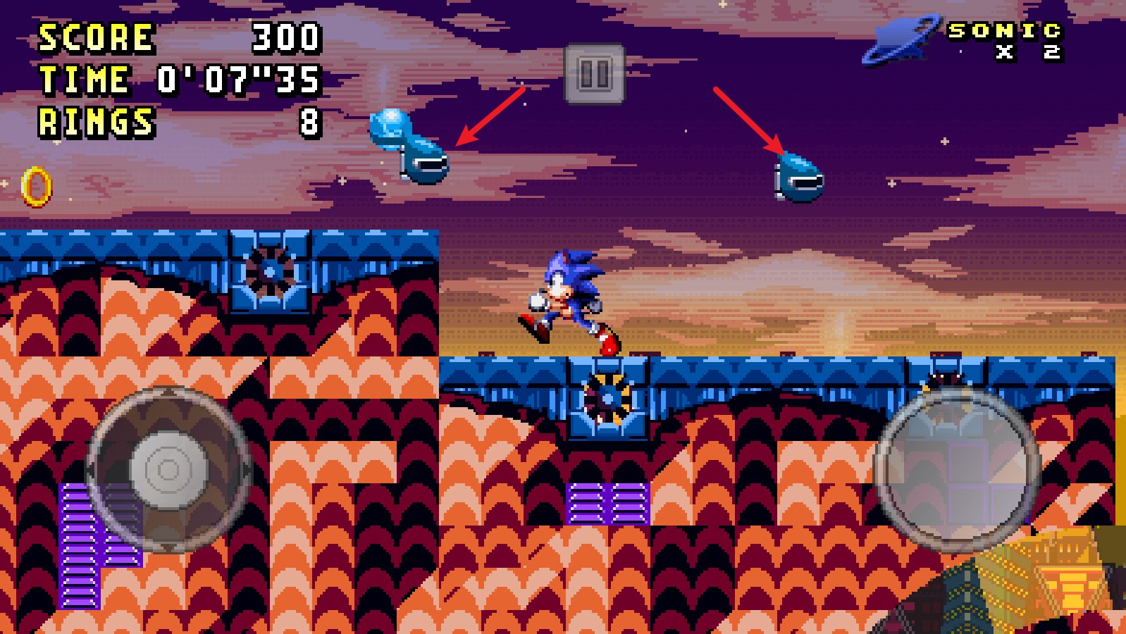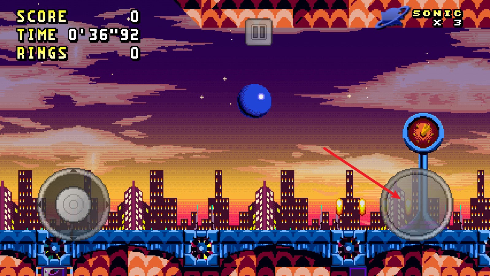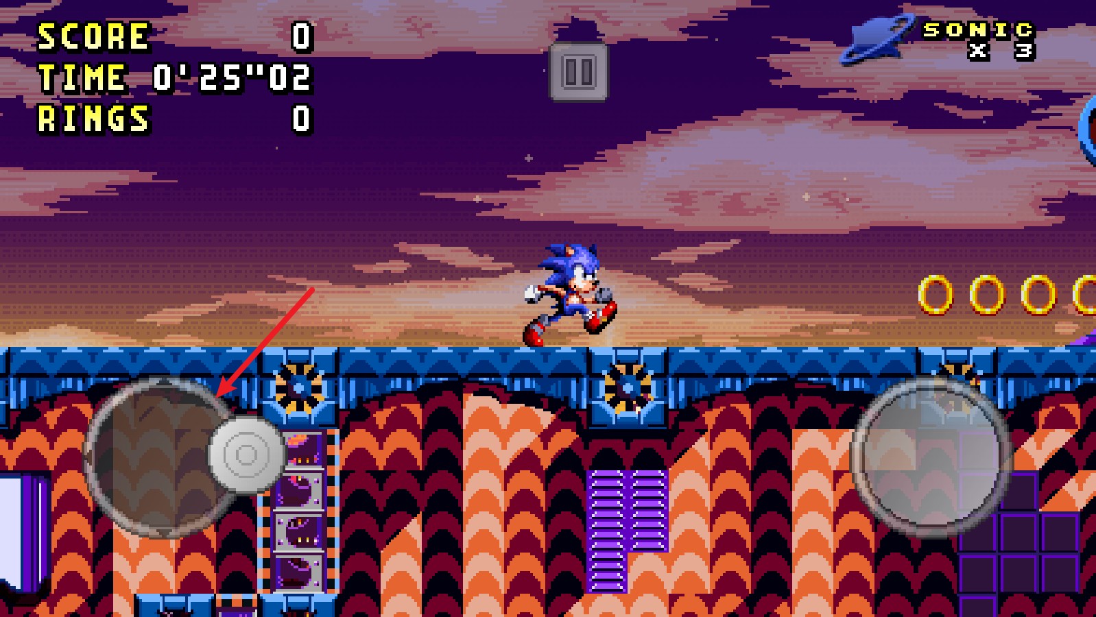 右側(cè)的按鈕能夠操控索尼克跳躍,而且長(zhǎng)按該按鈕的話,索尼克會(huì)跳得更高一些。